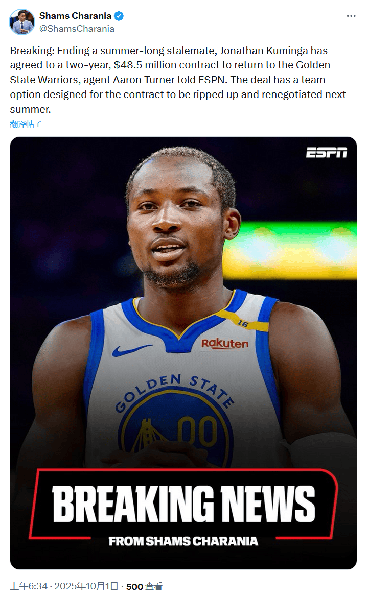Shams在文中指出,库明加的经纪人亚伦-特纳告诉ESPN,库明加和勇士队结束了长达一个夏天的僵局,他同意一份为期两年、价值4850万美元的合同重返勇士队。这份合同包含球队选项,球队可以在明年夏天撕毁合同并重新谈判。