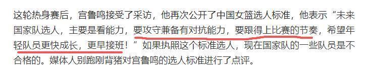 中国女篮国家队主教练宫鲁鸣,近段时间以来不断重申他的选人标准,并且这些标准不断在改变。在与尤文图特热身赛期间,他提出的选人标准是,“未来国家队选人,主要是看能力,要攻守兼备有对抗能力,要跟得上比赛的节奏,希望年轻队员更快成长,更早接班!”这一选人标准强调年轻队员要早些接班。