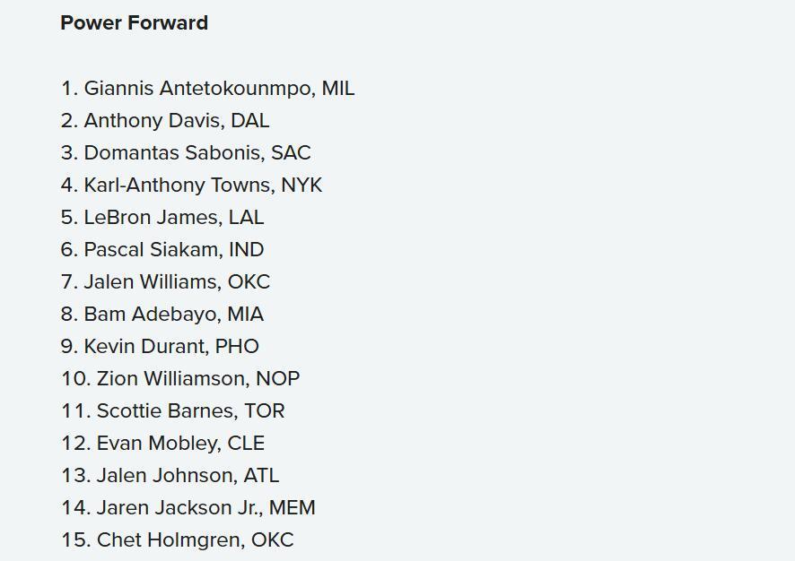1-5名:字母哥、浓眉哥、小萨、唐斯、詹姆斯;