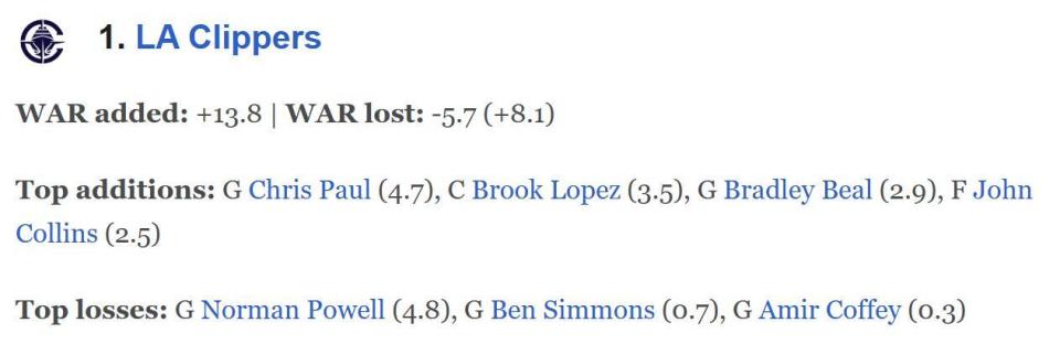 从这一档名单也不难看出,ESPN这份基于WAR调整幅度公布的评选榜单并非与球队实力直接挂钩,而是完全基于休赛期阵容的调整。