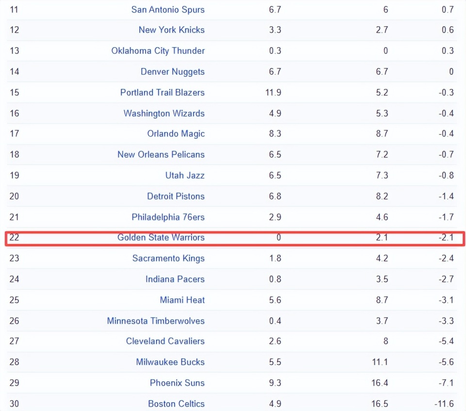 21-30名:76人、勇士、国王、步行者、热火、森林狼、骑士、雄鹿、太阳、凯尔特人。