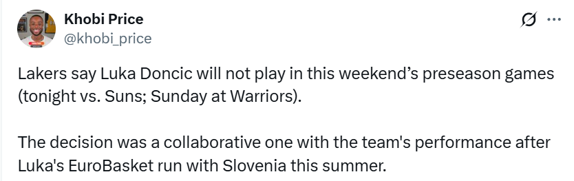 据湖人队记报道,东契奇并无伤病困扰,但由于今年夏天代表斯洛文尼亚队参加了欧洲杯,球队选择对他采取谨慎的策略。湖人及其体能团队着眼长远,希望他能循序渐进地为常规赛揭幕战做好准备。
