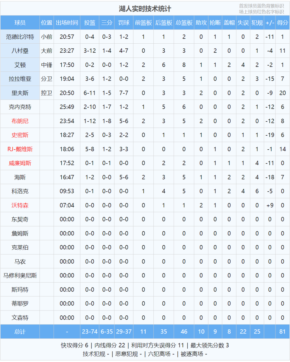 克内克特延续了夏季联赛的糟糕手感,本场投篮10中2,布朗尼投篮12中1。艾顿湖人首秀,2中0仅得1分8篮板2盖帽4失误。最后来看数据,说说你的心情: