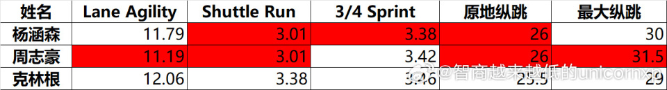 杨瀚森联合试训动态体测成绩与周志豪、克林根的比较