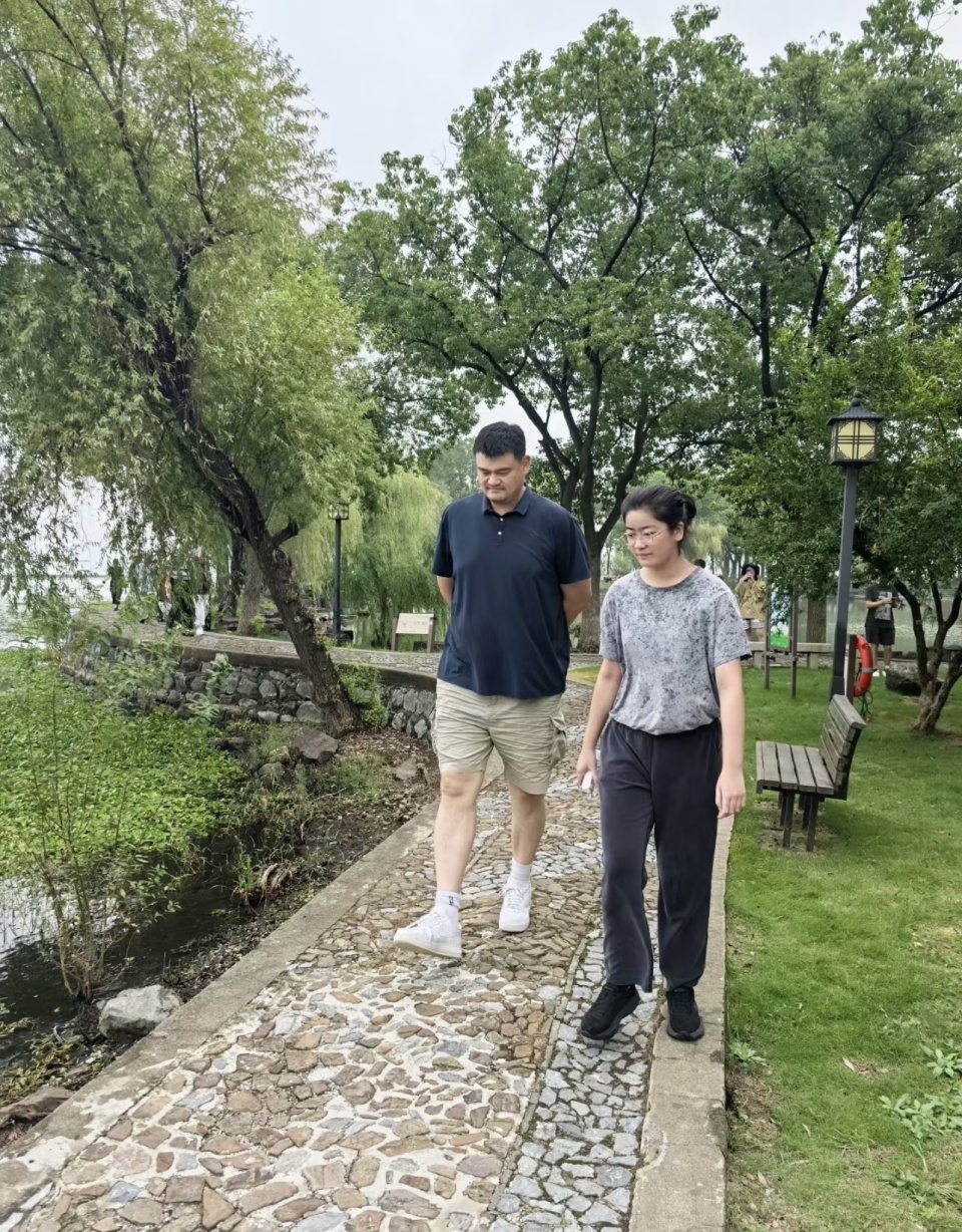 姚明国庆穿NBA装备旅游,已开始领退休金,女儿已经长到194!