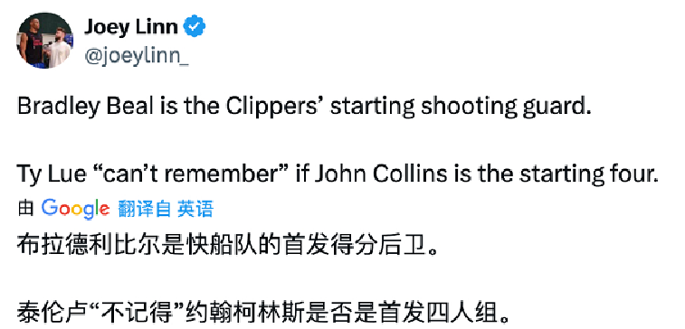 泰伦卢:快船首发五虎已确定4位,分别是哈登+比尔+伦纳德+祖巴茨。