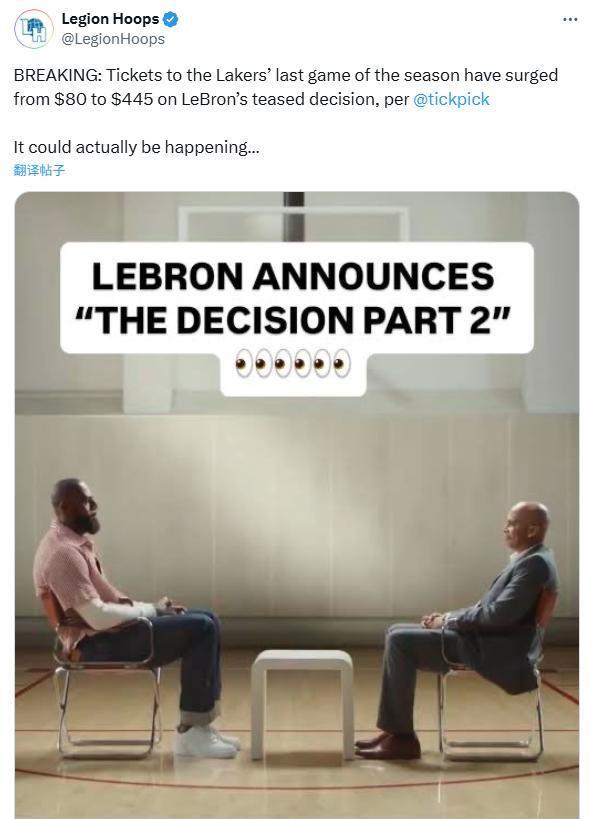 根据票务网站TickPick显示,在詹姆斯发布动态后,湖人常规赛最后一个主场比赛对阵爵士的门票价格在短短几个小时内从原本的85美元已经飙升至445美元,并且还有继续上升的势头。