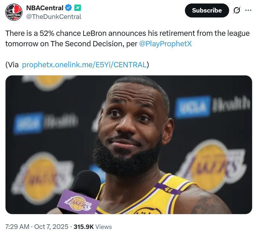 为此,其中美国顶级体育预测市场ProphetX也放出预测概率,指出詹姆斯“决定二”52%的可能是宣布退役。