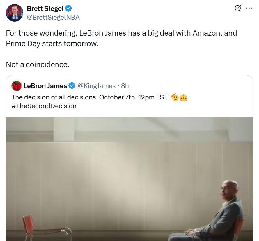 同时曝出一条重要信息,詹姆斯不久前才与亚马逊签下了一份大合同,为自己退役后转型提前布局,而Prime会员日明天就开始了,这绝非偶然。