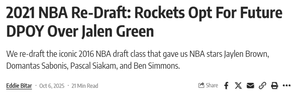 火箭队看走眼!美媒重排21届选秀:杰伦格林跌至第7湖人队捡大漏
