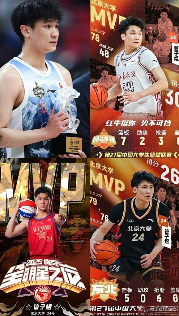 他在4个月内狂揽4个MVP,分别是CBA星锐赛MVP、CUBAL东北赛区MVP、全明星MVP以及CUBAL总决赛MVP,靠硬实力圈粉无数。管子煜身高2米,臂展2米10,有出色的持球能力和稳定的投射,身体好、球商高,他的锋线持球打法和敢打敢拼的比赛气质不由得让人想起被称为“四字外援”的丁彦雨航,这么好的苗子自然引起多支CBA球队的关注,今年7月份甚至有NBA球探到场观看他打球,认为其可塑性很高。