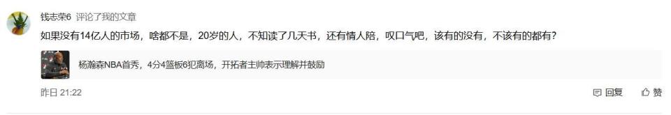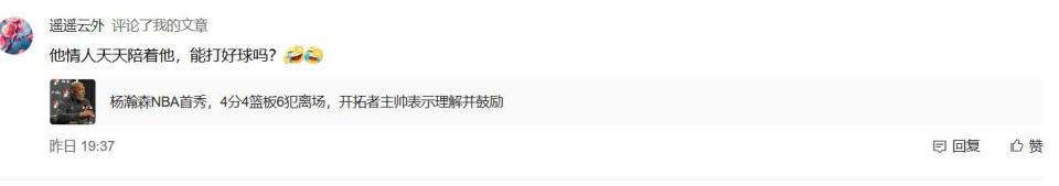 看网上球迷的评论,“如果没有14亿人的市场,啥都不是,20岁的人,不知读了几天书,还有情人陪,叹口气吧,该有的没有,不该有的都有?”、“他情人天天陪他,能打好球吗?”女朋友陪着一起去NBA,这样的情况确实不多见,可能这些年中国球员进入NBA的很少,但是前面的姚明、易建联、周琦也没有这样啊。虽然说现在的年轻人恋爱自由,但是杨瀚森还只是一个20岁的孩子,主要精力还是应该放在篮球上,如果被其他繁琐的事情分心,就得不偿失了。