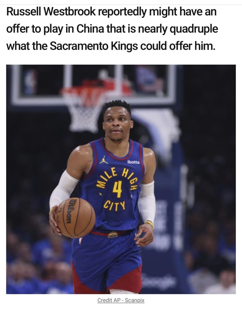 国王记者Dave透露,威少很可能收到了一份来自中国球队的报价,为期半个赛季价值为国王可提供合同的近4倍。