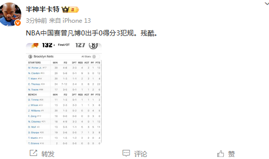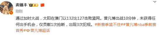 北京时间10月10日,NBA季前赛中国赛,篮网127-132不敌太阳。中国球员曾凡博上演篮网首秀,出场10分06秒,有1次抢断3次犯规。 ​​​