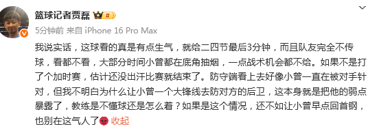 篮球记者贾磊发文点评:我说实话,这球看的真是有点生气,就给二四节最后3分钟,而且队友完全不传球,看都不看,大部分时间小曾都在底角抽烟,一点战术机会都不给。如果不是打了个加时赛,估计还没出汗比赛就结束了。