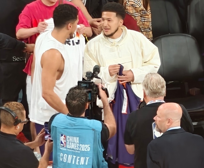 赛后布克与他的模仿者“中国布克”合影留念,并赠送了自己亲笔签名的球衣。“中国布克”因为长相和打法酷似布克,在社交媒体上走红。