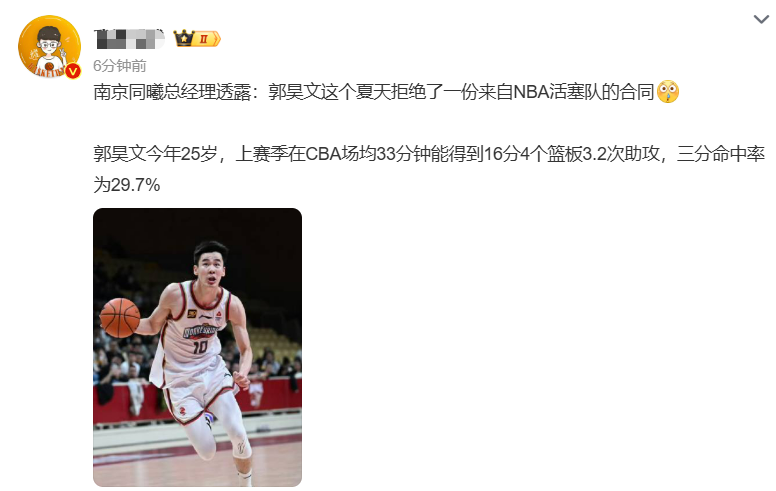 哟呵,郭昊文今年夏天拒绝了活塞提供的NBA合同。