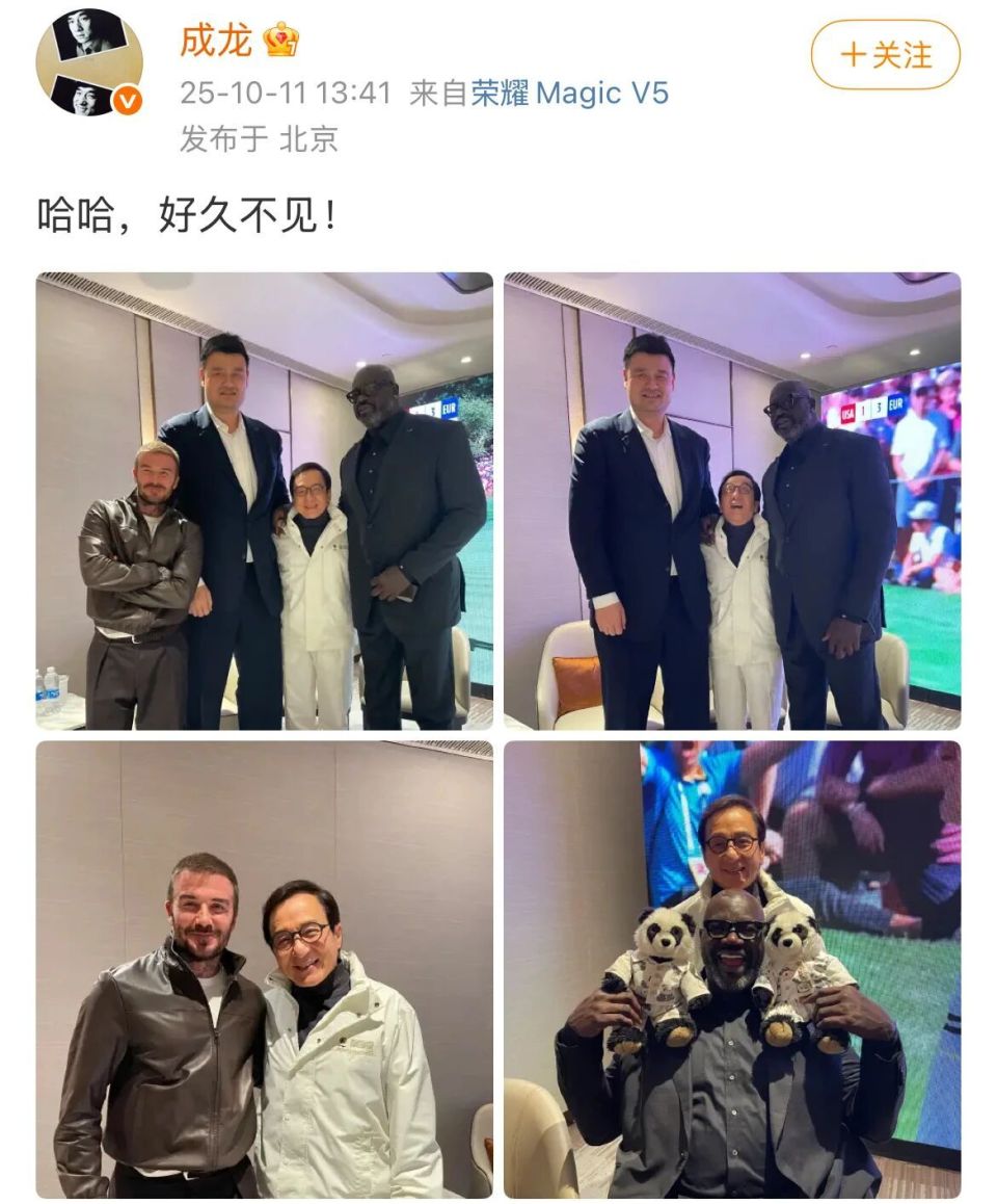 10月11日,成龙晒出多张与贝克汉姆、姚明、奥尼尔的合影,并配文:哈哈,好久不见!奥尼尔也在其社交媒体上发文:好友相聚。Long time no see my friends。