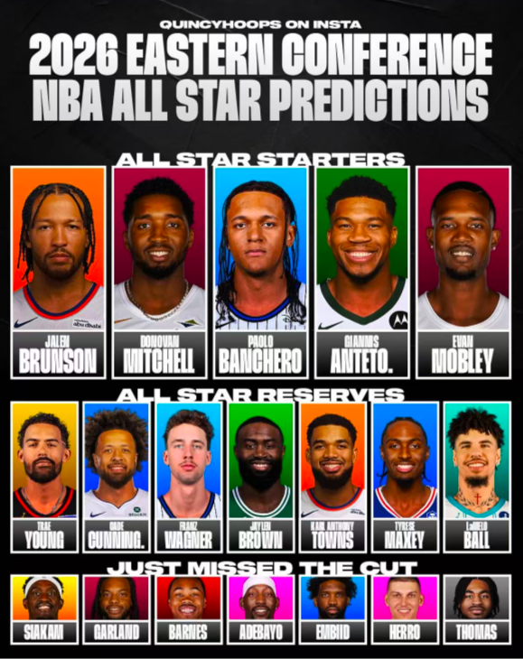 东部全明星先发:布伦森(尼克斯)、米切尔(骑士)、班凯罗(魔术)、扬尼斯(雄鹿)、莫布利(骑士);