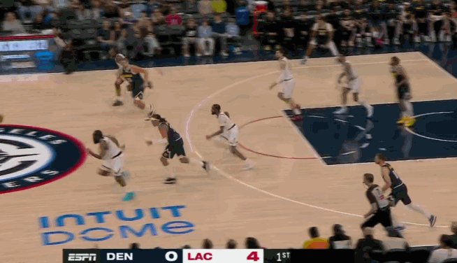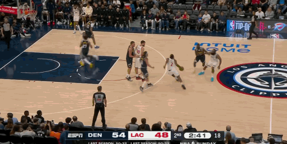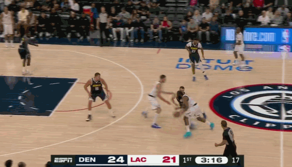 易边再战,快船用布朗和巴图姆换掉莱昂纳德和科林斯,掘金继续使用首发。穆雷上篮得分,约翰逊、布劳恩三分命中,掘金一波8-0反超。科林斯三分命中,琼斯打成2+1,快船追平掘金。瓦兰扣篮,保罗换下哈登,戈登中投命中。第三节打到一半,双方所有主力都被换下。布朗连续罚球得分,瓦兰勾手命中,三节战罢,掘金76-75领先快船。