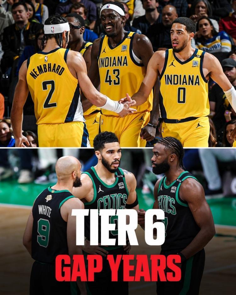 第六档有凯尔特人和步行者两组三巨头。绿军是塔图姆布朗和怀特,这三人还是被低估了,塔图姆和布朗都属于当打之年,只不过下赛季塔图姆报销而已,但是实力还是顶尖的。步行者的哈利伯顿内姆哈德和西卡并列,这倒没什么问题,不过步行者的团队篮球要高于他们球队的球星的个人实力,每个人都很关键。