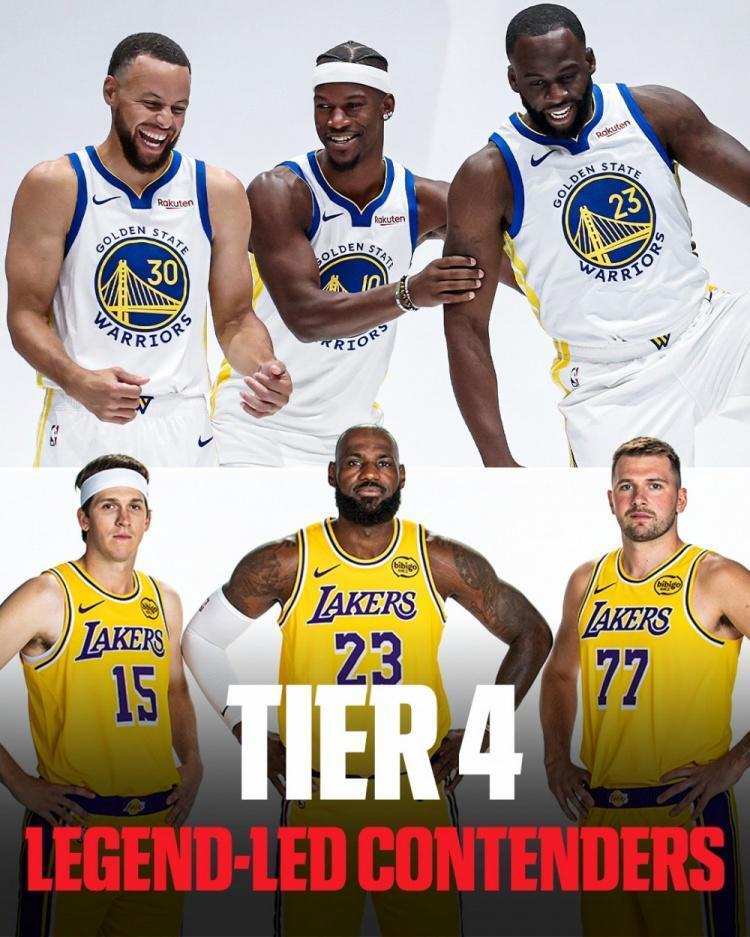 勇士和湖人排在了第四档。勇士巴特勒库里和追梦,湖人则是詹姆斯东契奇和里夫斯。勇士的三巨头虽然年龄比较大了,但是实力还是有的,油箱里都有油,并且能够让勇士充满竞争力。湖人拥有两个联盟前十的球员,詹姆斯虽然没有了巅峰,但是状态还是要比大多数球员出色。里夫斯也是联盟进攻能力最好的三当家了。