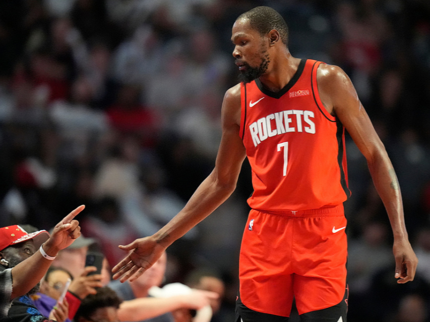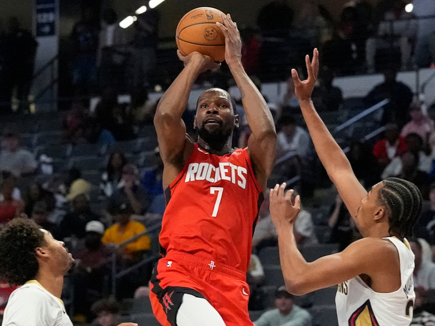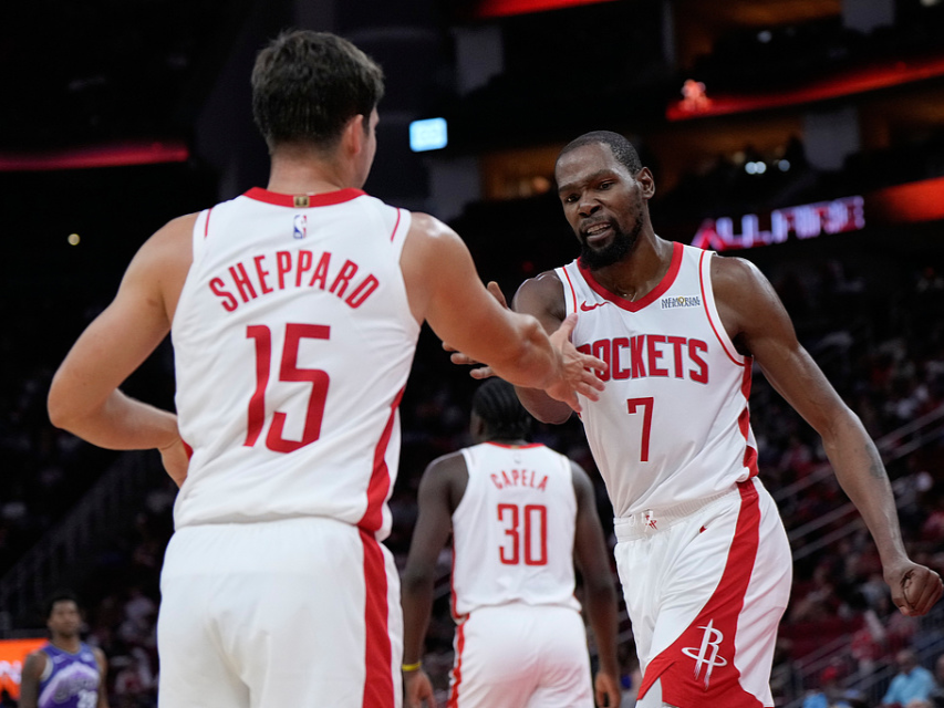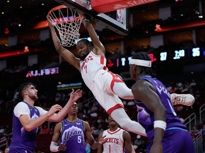 杜兰特轻舒长臂,一记精准中投应声入网,火箭第三节的攻势已如潮水般不可阻挡。