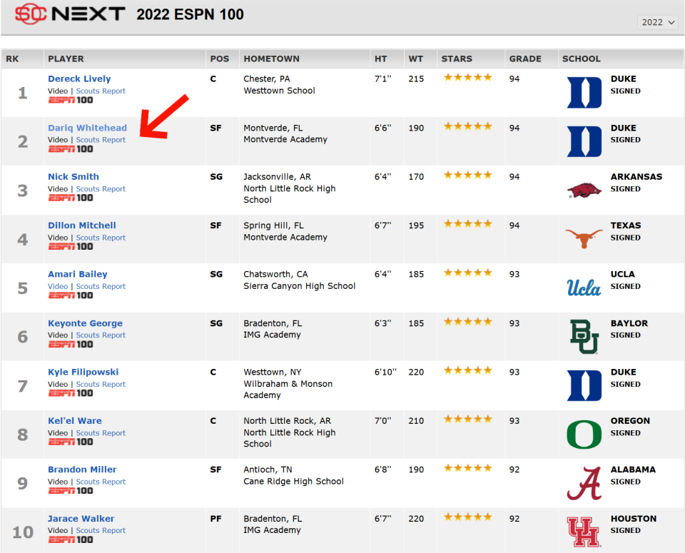 达里克-怀特黑德身高2米01,臂展2米08,锋卫摇摆人。怀特黑德高中就读于篮球名校蒙特沃德学院,选秀网站Rivals将他排在全美第一,ESPN把他排在全美第二,247sports则将其排在全美第三。总之,怀特黑德就是2022届顶级高中生。
