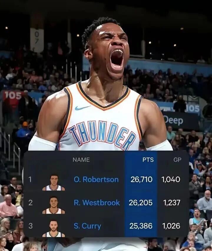 值得一提的是,目前威少NBA生涯总得分为26205分,暂时位列联盟史上第20名,高居控卫位置第二名,仅落后头名的奥斯卡-罗伯特森(26710)505分。