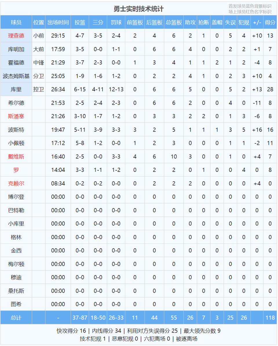 今天克林根非常积极,首节打了7分38秒,7投4中拿到9分8篮板。杨瀚森上场时间被压缩,首节只打了4分15秒,3投1中拿到2分4篮板。第一节打完,开拓者30-22领先勇士,库里单节得到10分3篮板3失误。勇士全队三分球11中1!