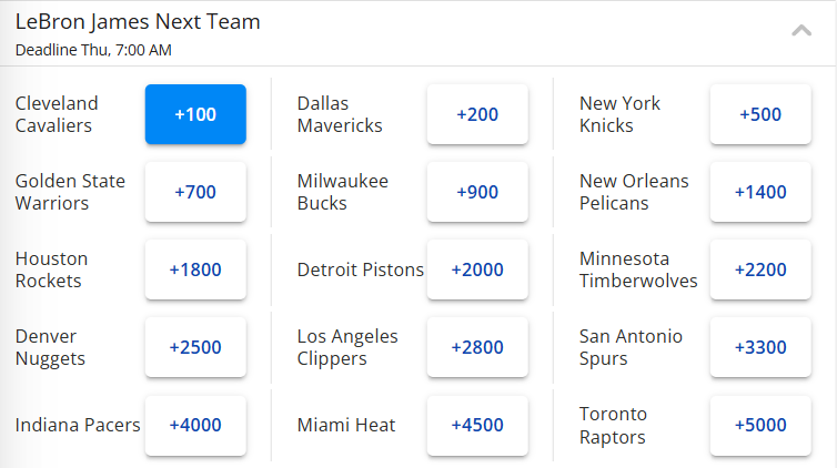 不过,在最新的詹姆斯下家赔率方面,尼克斯暂时排名第三,排在第一的依然是詹姆斯的家乡球队骑士,拥有欧文和浓眉这两位前队友的独行侠位列第二。最新赔率排名如下——