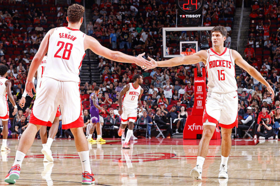 理想情况下,火箭新赛季首发应该是:阿门+芬尼史密斯(健康状态)+杜兰特+小贾+申京,当然乌度卡可以做出很多改变,比如让亚当斯上场打双塔,让伊森首发分担杜兰特和阿门防守压力,甚至是再给探花谢泼德一些时间。其实谢泼德绝对有不错的上限,季前赛场均15分4篮板3助攻,组织方面有潜力,视野开阔,三分出手也很快,抢断判断和发起反击的能力也不错,他就缺乏更多的实战。收官战打老鹰,谢泼德带第三阵容,29分钟22中12,轰下29分6篮板6助攻4抢断3盖帽。火箭常规赛是有足够容错率的,这是谢泼德的机会。
