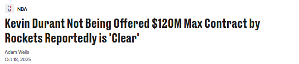 北京时间10月18日,凯文-杜兰特即将开启加盟火箭队的首个赛季,同时这也是他当前合同的最后一年,但目前他似乎无法获得一份顶薪续约合同。据ESPN名记文霍斯特透露,情况“很明确”——火箭队尚未向杜兰特提供他有资格获得的2年1.2亿美元续约报价;若球队有意,这份合同“现在早该谈妥了”。