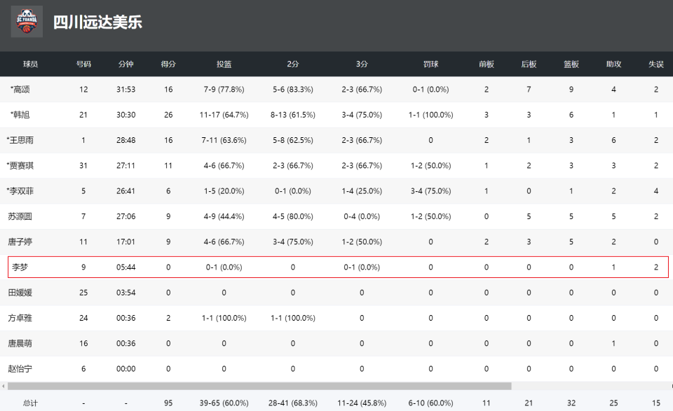 轮休了两场比赛的李梦终于复出,但她明显还是身体不适,据说她是感冒了,此役全场比赛只打了5分44秒,1中0,拿0分1助攻2失误。(李梦实际上等于只打了两场全锦赛第二阶段,后面的三场等于没打)