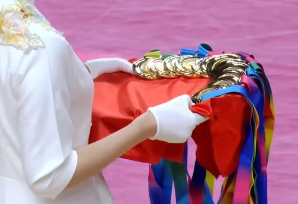 本次全锦赛冠军的金牌特写没有很近,无法看清楚上面的图案,只能看见是金色的奖牌,不知道李梦是哪个环节不满意。