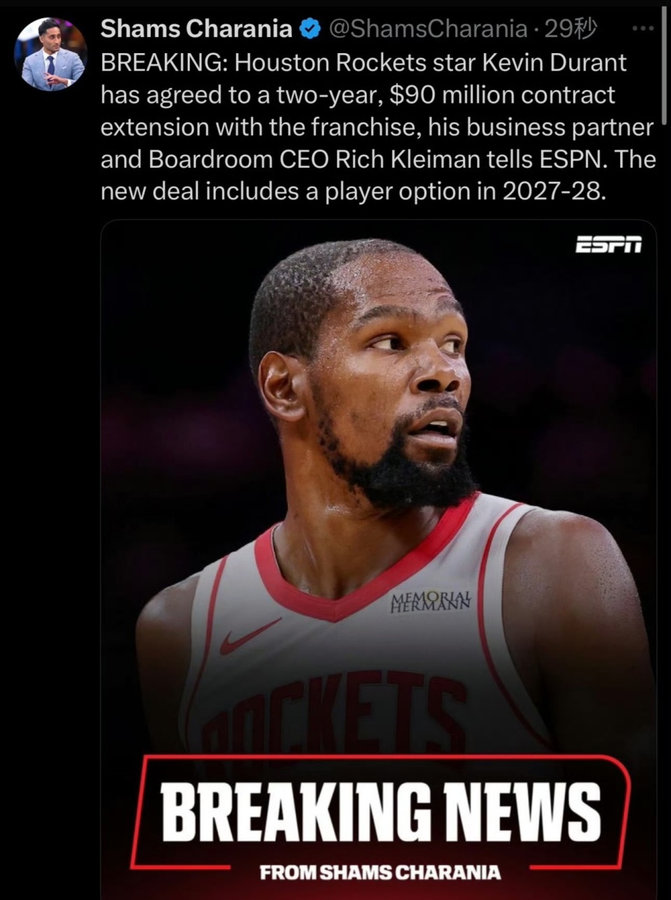 杜兰特已经与火箭完成了一份2年9000万美元的提前续约,而且最后一年(27-28赛季)为球员选项。