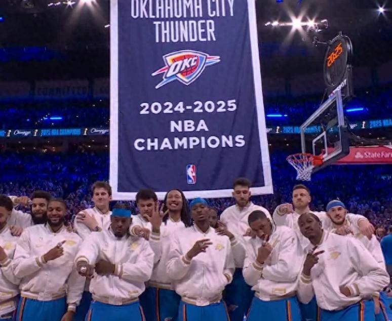 NBA新赛季终于在今天重燃战火,联盟也是安排了雷霆对阵火箭,成为本赛季的开官之战。赛前,雷霆在主场举办了隆重的总冠军领取仪式。