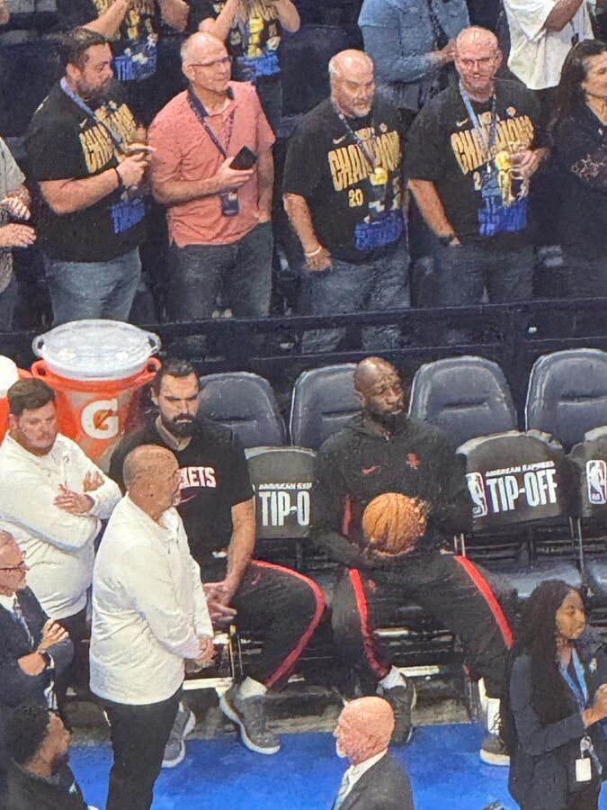 第一场比赛的最大看点,众所周知,火箭球员看雷霆升总冠军旗帜。