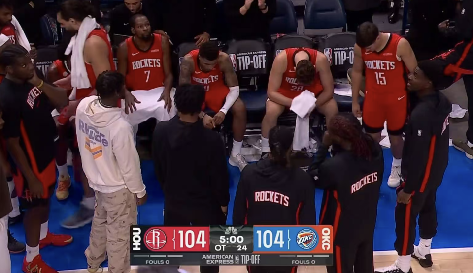 但是火箭没有暂停了呀,瞧把一旁的申京给紧张的:哥,哥,哥,我们没暂停了。