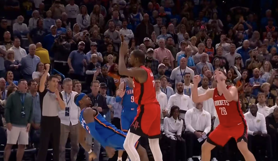 亚历山大投篮被伊森帽掉之后,杜兰特抢到防守篮板,马上做出叫暂停的手势。