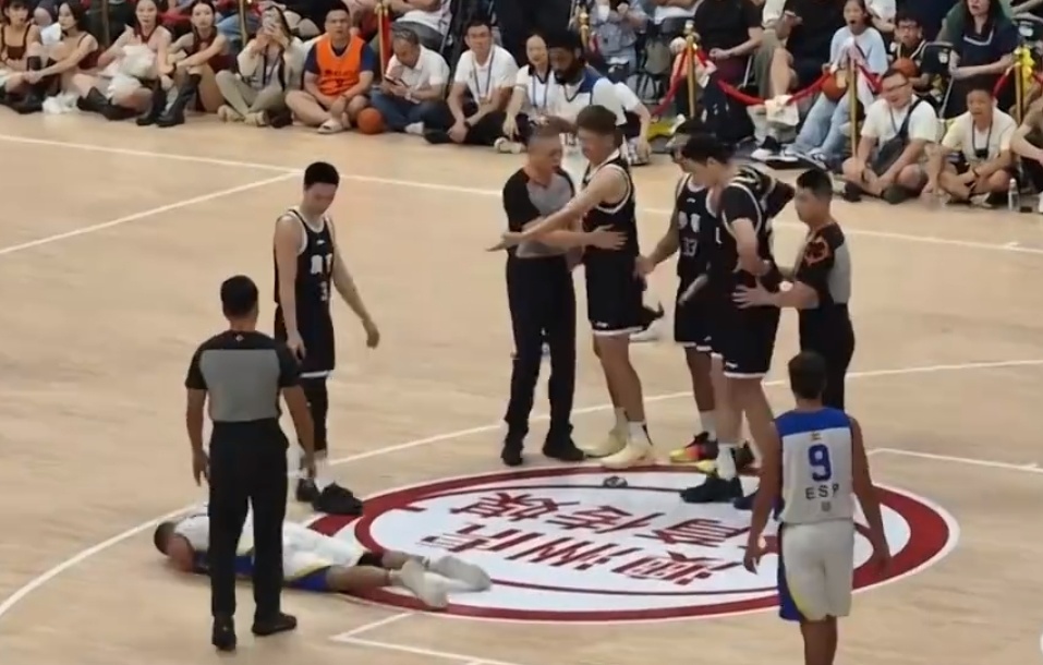 至于周鹏为什么会做出这样的动作,其实是有原因的。这支赫罗纳球队中基本上都是业余球员,从比赛一开始,对方的防守动作就非常大,特别是这个14号,在和赵睿的对位中多次挑衅,并把赵睿的脸抓了两道口子。就在周鹏这次爆发前,这个14号还和赵睿进行了一次身体对抗。而且在和周鹏的纠缠中,这个14号更是双手后摆,撅着屁股将周鹏卡在身体后面,完全就不是篮球赛场上该有的动作。在这样的情况下,周鹏彻底爆发了,直接一拳一肘将他干翻在地,应该是早就看他不顺眼了,有为赵睿出头的意思。