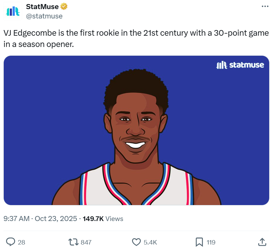 全场砍下34分,不仅让其超越艾弗森创造76人队史首秀得分新纪录,也成为新世纪以来首位能够在揭幕战就轰下30+得分的新秀。