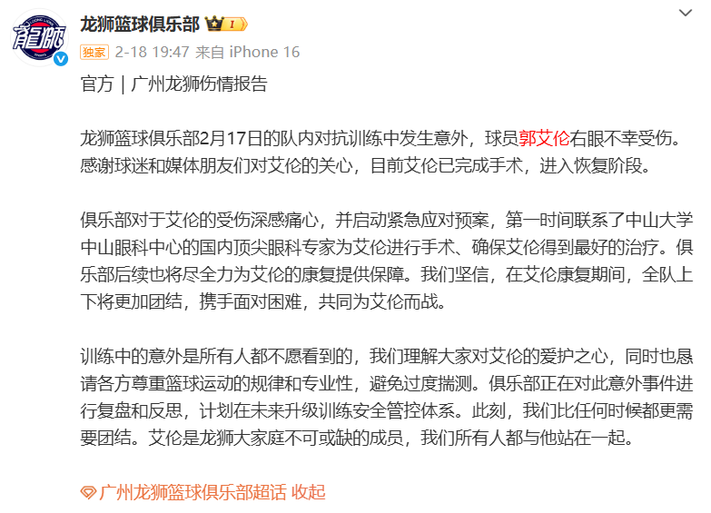 24-25赛季,郭艾伦为广州队打了11场常规赛,场均出战27.5分钟贡献15.7分3.3板5.7助,包括单场25分7助、32分7助、27分12助,以及40分5助,证明了自己仍是本土顶级后卫,可惜今年二月份在队内训练中右眼严重受伤从而休战至今,新赛季(12月12日开打)为他的D类顶薪合同年应该可以如期复出。