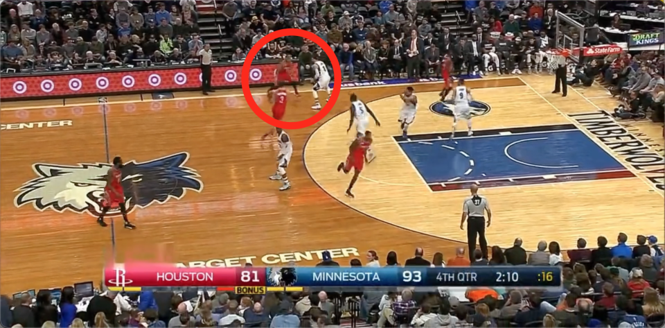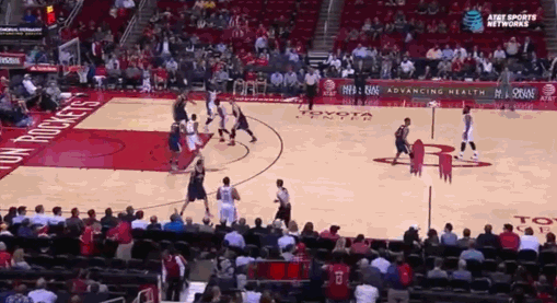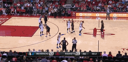 上图为2015-2016赛季,火箭主场迎战独行侠上半场最后2.2秒,哈登四分之三场站位后,借助队友内内Logo位置掩护后,接阿里扎传球完成奔袭上篮。