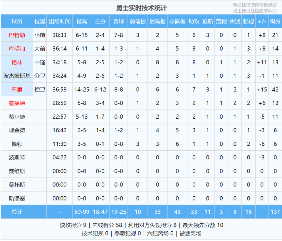 这是库里生涯第72次单场40+,在NBA控卫当中排名历史第二,仅次于奥斯卡-罗伯特森(77次)。先来看看本场比赛的数据统计:
