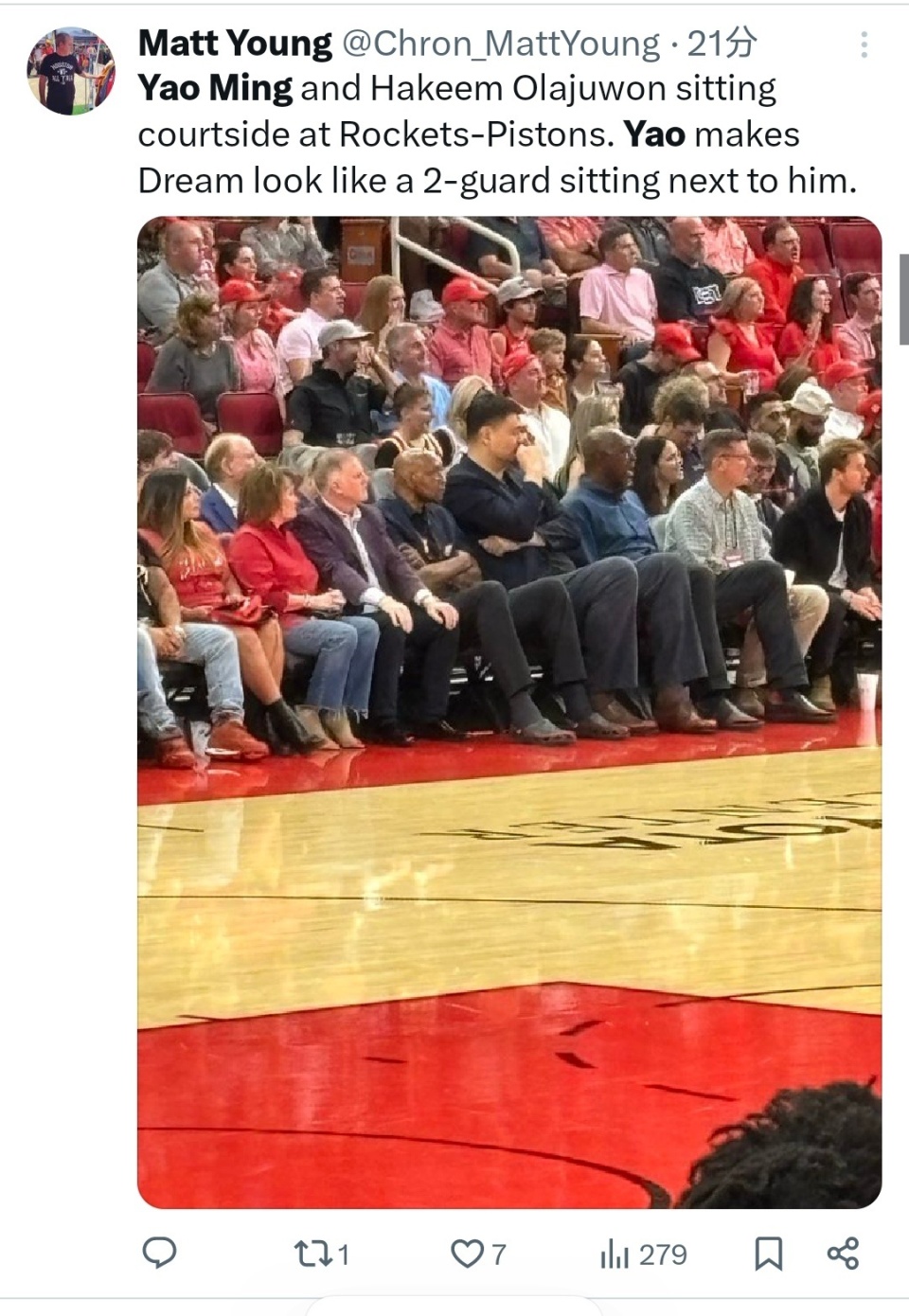 需要说明的是,这是姚明自2017年2月的球衣退役仪式后,首次来到休斯顿主场观看火箭的比赛。该场比赛,火箭在主场121-117力克公牛,哈登砍下42分12篮板9助攻。根据记录,姚明上次现场观战的火箭阵容,仅卡佩拉一人仍在火箭阵中,该场比赛卡佩拉8中7得到14分9篮板。而卡佩拉期间曾离开火箭队,直到今年夏天才重回火箭队。