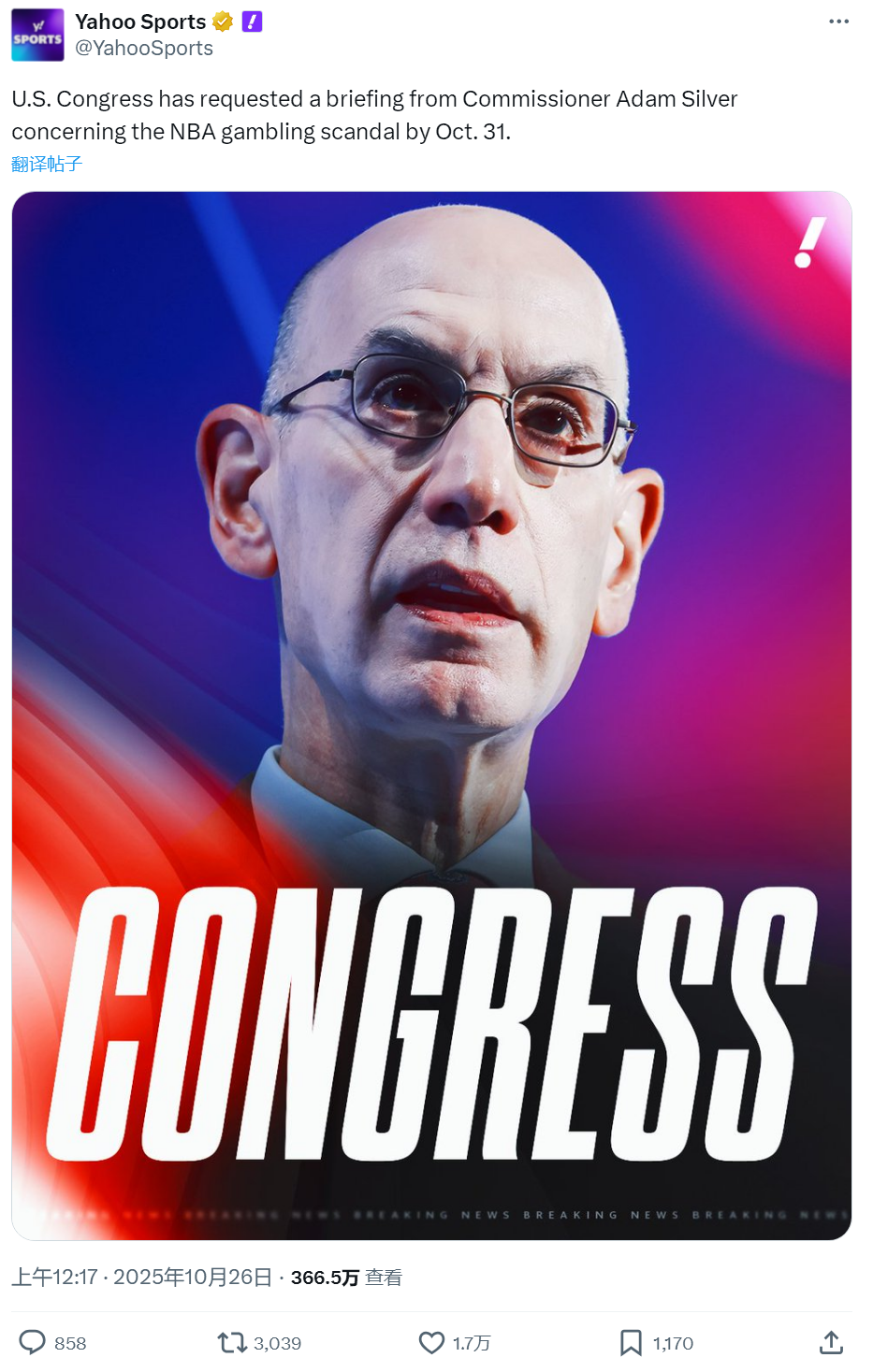 北京时间10月26日,据雅虎体育报道,美国国会下属的众议院能源与商业委员会,针对NBA最近一系列的赌博丑闻展开调查:NBA总裁亚当-萧华必须在10月31日之前,对此事作出汇报。萧华回应,自己对该指控“深感震惊和不安”。