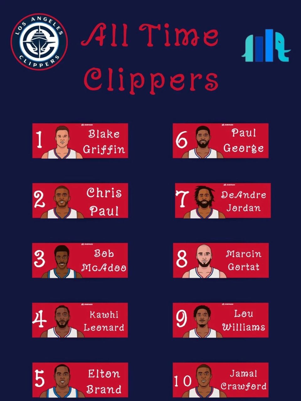 今年夏天,快船自媒体LA Clippers Muse和球迷评选快船队史十大球星:1、格里芬;2、保罗;3、鲍勃-麦卡杜;4、伦纳德;5、埃尔顿-布兰德;6、保罗-乔治;7、小乔丹;8、马尔钦-戈塔特;9、路易斯-威廉姆斯;10、贾马尔-克劳福德。