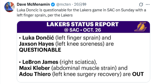 东契奇的超神表现引湖人将帅集体夸赞他,不过下一场对阵国王,东契奇(左手手指扭伤)因伤出战成疑,海斯(左膝酸痛)也是可能出战,詹姆斯(右侧坐骨神经痛)、克勒贝尔(腹肌拉伤)及阿杜-蒂耶罗(左膝术后恢复)继续缺席比赛。