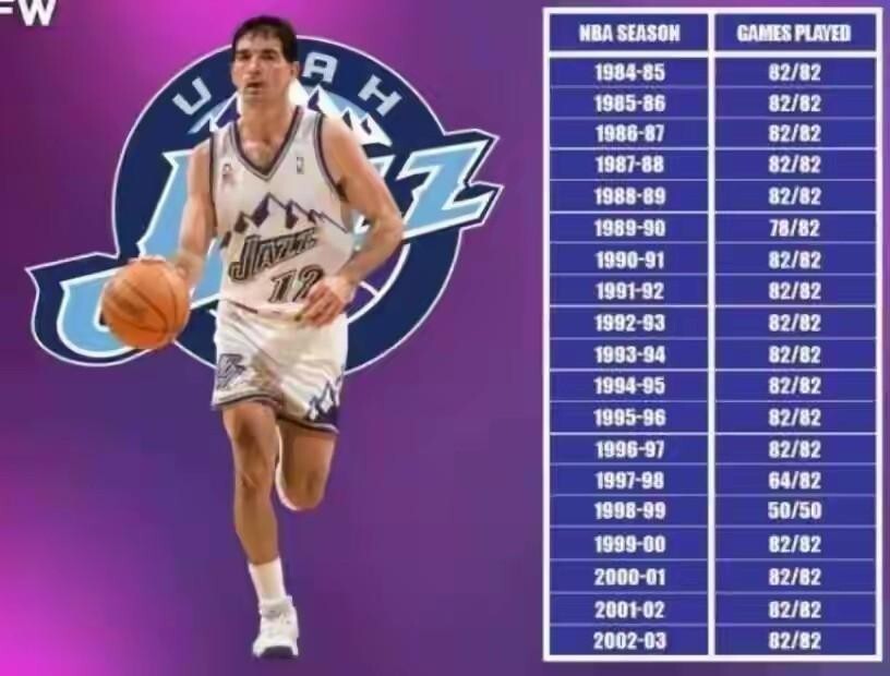 斯托克顿职业生涯总共打了19个赛季,虽然不是很多,但他有17个赛季都是全勤,生涯总共只缺席了22场比赛,这项数据可以说是非常夸张的。毕竟现在很多球员一个赛季缺席的比赛都接近40场了,而这只是人家职业生涯总共缺席的场次,所以光从这项数据上看他们就已经很难超越斯托克顿了。